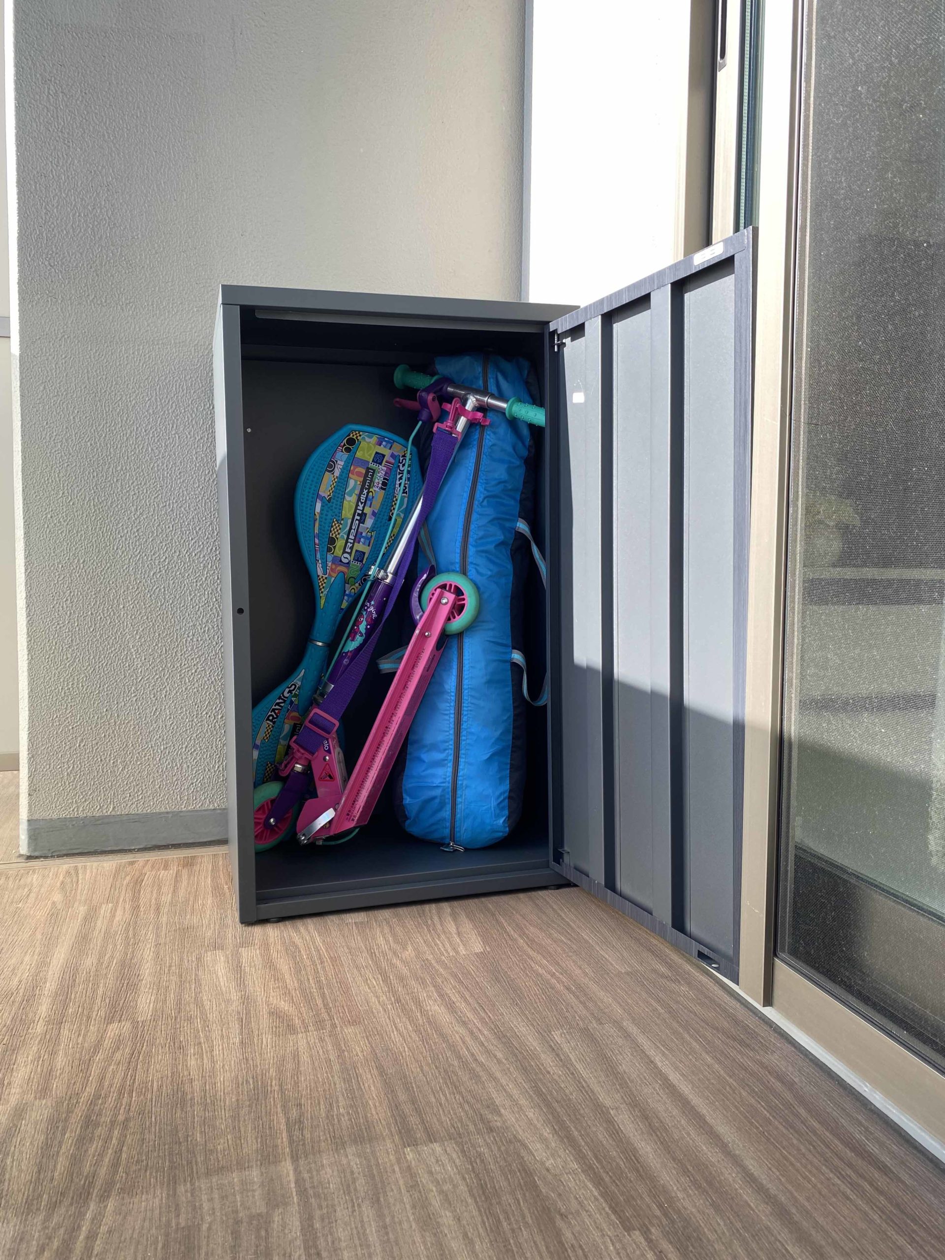 バルコニスト収納庫は、省スペースでもしっかり収納できる設計で、掃除用品や園芸グッズ、アウトドアアイテムなどをすっきり整理できます。