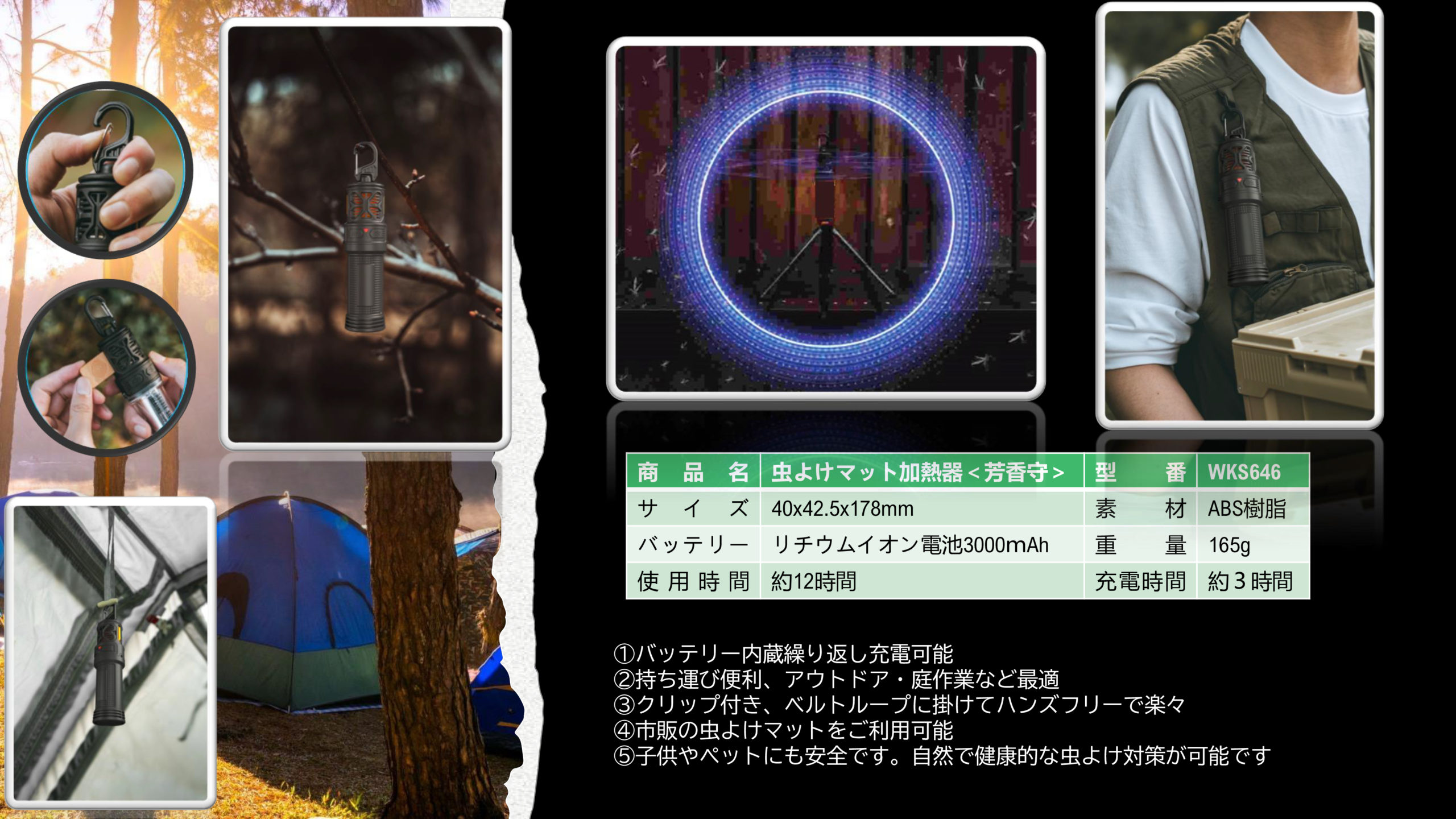 | 商品説明 | ●付属品:USB充電ケーブル(Type-C) ●市販の加熱式虫除けマット(別売)を入れてどこでも持ち運び ●吊り下げフック付き ●防水IPX6 ●電池残量確認ボタンあり ●USB充電式で繰り返し充電可能 ●アウトドア、庭作業に最適 ●約3時間充電で、約12時間使用可能 |
