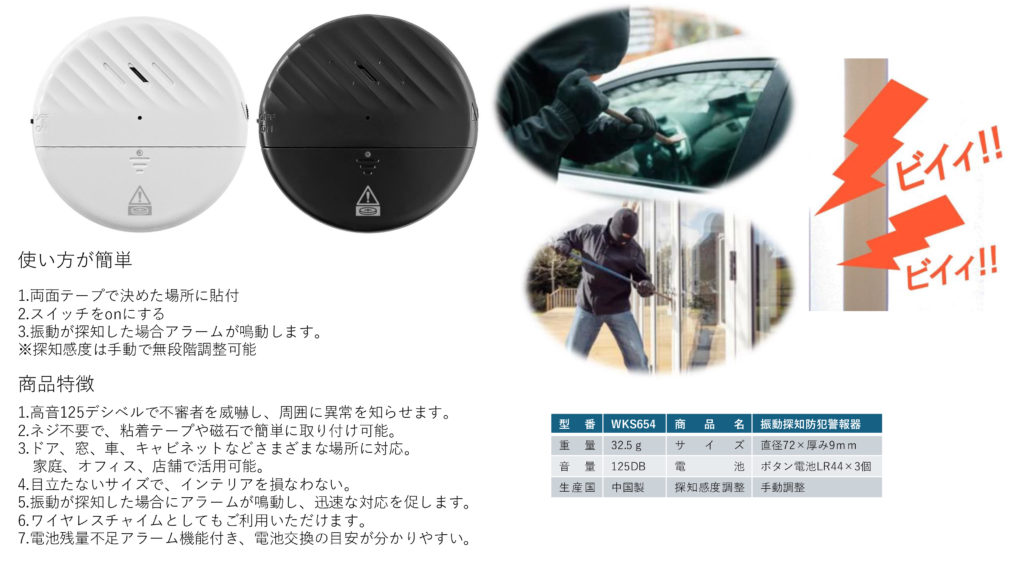 丸型の振動探知警報器は、窓ガラスや扉に貼り付けるだけで設置できる手軽な防犯アラームです。
